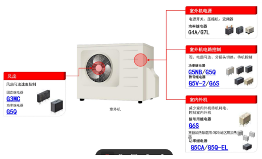 歐姆龍G3MC固態(tài)繼電器和G5Q功率繼電器在空調(diào)外機(jī)的中的應(yīng)用主要用于風(fēng)扇馬達(dá)速度控制。