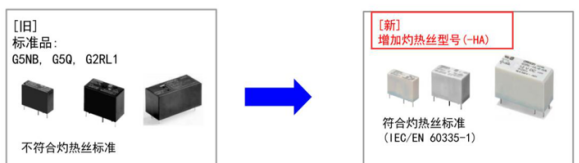 歐姆龍繼電器G5NB/G5Q/G2RL系列為此推出灼熱絲-HA型號,兩者的區(qū)別就在于外殼和基座的塑料材質(zhì)是否為阻燃材料。