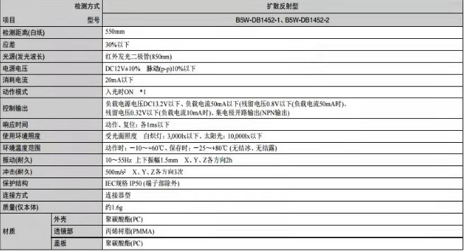 歐姆龍B5W-DB的光源為紅外發(fā)光二極管(850nm),受光面照度在白熾燈的情況下為3,000lx以下、太陽光的照度下為10,000lx以下。不僅如此,B5W-DB的外殼采用聚碳酸酯(PC)、透鏡部采用丙烯樹脂(PMMA)、蓋板采用聚碳酸酯(PC)材質(zhì),保護(hù)結(jié)構(gòu)符合IEC規(guī)格IP50標(biāo)準(zhǔn)(端子部除外),可幫助設(shè)備實(shí)現(xiàn)強(qiáng)耐用性。