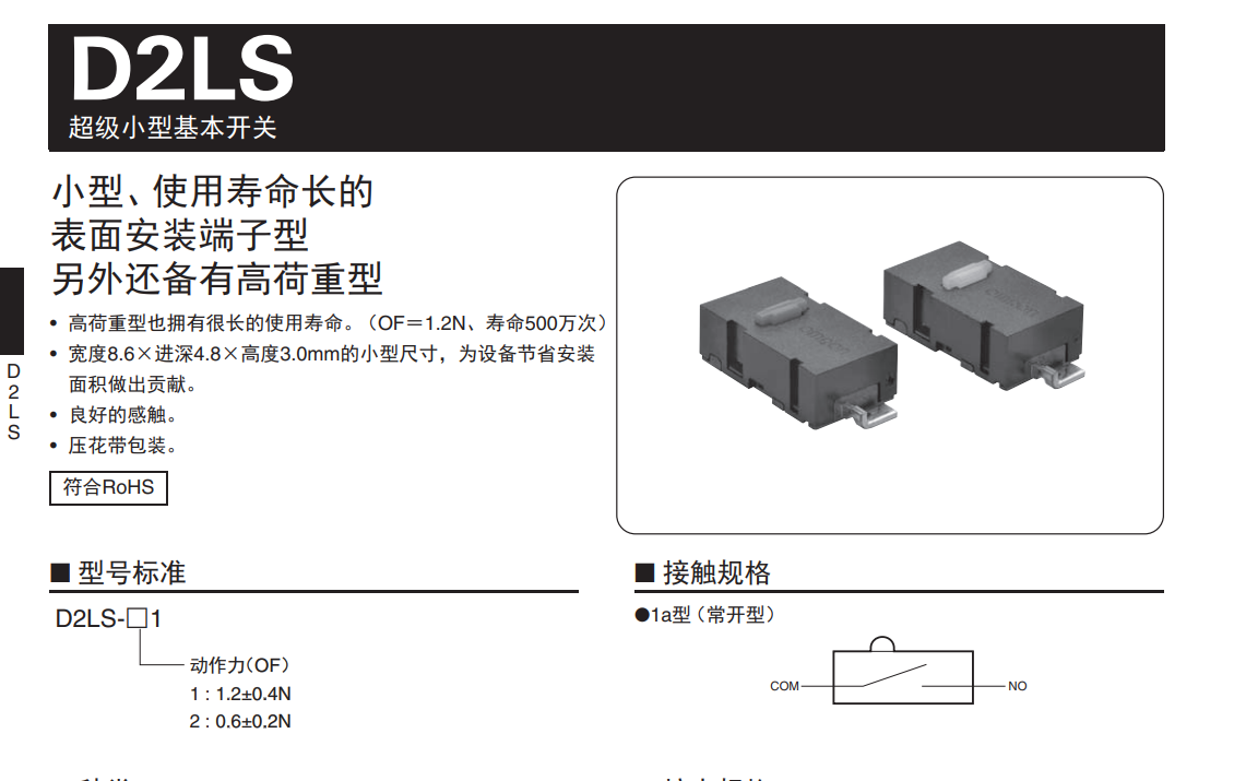 在智能插座中會有用到歐姆龍的微動開關(guān)和繼電器,今天我們來說說開關(guān)插座中最常用的歐姆龍產(chǎn)品系列,D2LS和SS系列,如下圖