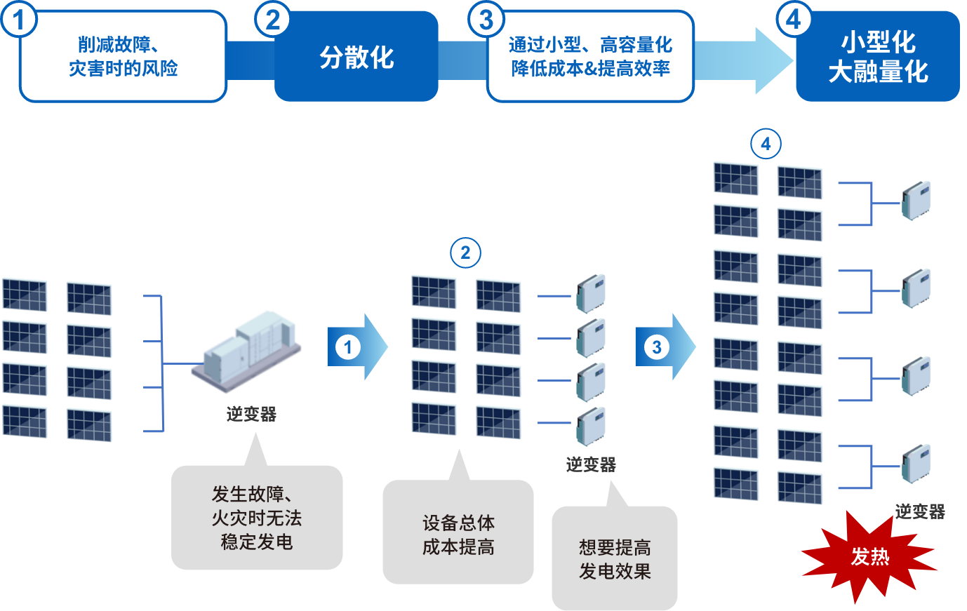 近年來,太陽能發(fā)電系統(tǒng)上的需求不斷發(fā)生變化。作為地震或水災(zāi)等災(zāi)害風(fēng)險(xiǎn)對策,更加穩(wěn)定的電力供給需求愈發(fā)高漲,并出現(xiàn)了從集中型系統(tǒng)向分散型系統(tǒng)轉(zhuǎn)化的趨勢。并非通過1臺(tái)光伏逆變器執(zhí)行電力轉(zhuǎn)換,而是分散至多臺(tái)光伏逆變器,由此降低了發(fā)生災(zāi)害時(shí)因設(shè)備故障等所致發(fā)電停止的風(fēng)險(xiǎn)。此外,各設(shè)備或機(jī)器上通過高容量、大電流化的配置提高了發(fā)電效率,并通過小型化、輕量化削減了設(shè)備投資,因而要求有效利用設(shè)備的呼聲愈發(fā)高漲。而另一方面,伴隨小型化、高容量化的發(fā)展,當(dāng)務(wù)之急是減少設(shè)備本身產(chǎn)生的熱量,這是造成能量損失和降低設(shè)備使用壽命的一個(gè)因素。