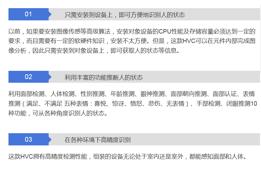 在人臉識別設(shè)備裝載型圖像傳感元件“HVC(Human Vision Components)”中,集成了面部認(rèn)證、表情推測、手部檢測等可以識別個人狀態(tài)的圖像傳感技術(shù)“OKAO Vision”,其中包括10種算法和相機(jī)模塊。只需裝載到現(xiàn)有的設(shè)備中,即可在原有功能的基礎(chǔ)之上,添加智能識別人臉的功能。