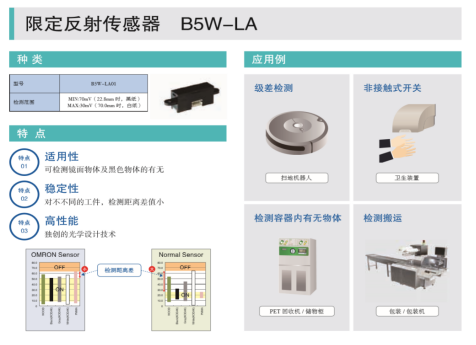 歐姆龍反射型傳感器可以使掃地機在運作中遇到障礙物時,可透過機身感應(yīng)而變換方向,避開桌椅角、臺階等,減少碰撞、防止掉落機會,歐姆龍限定反射型傳感器B5W-LA01可以檢測鏡面反射物體和透明物體,不易受檢測物體顏色,材質(zhì)影響,穩(wěn)定性高,模擬電壓輸出,最高檢測距離70mm。
