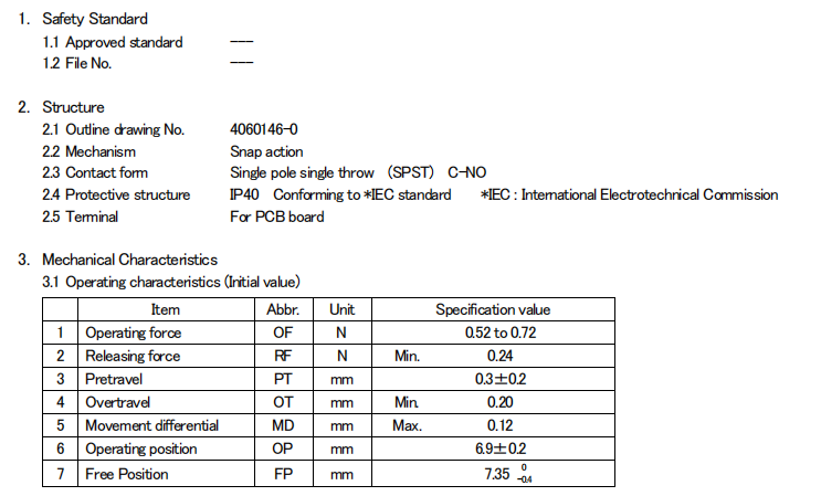 D2FC-F-7N, 克力為:60+/-15G,壽命為500萬次;