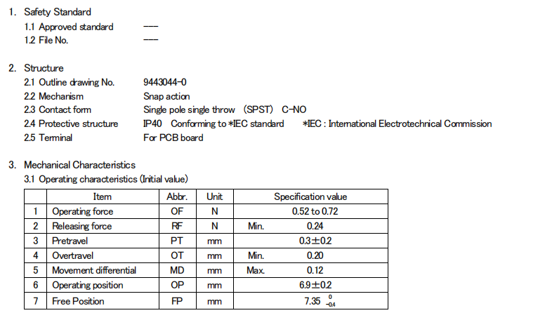 D2FC-F-7N, 克力為:60+/-15G,壽命為500萬次;