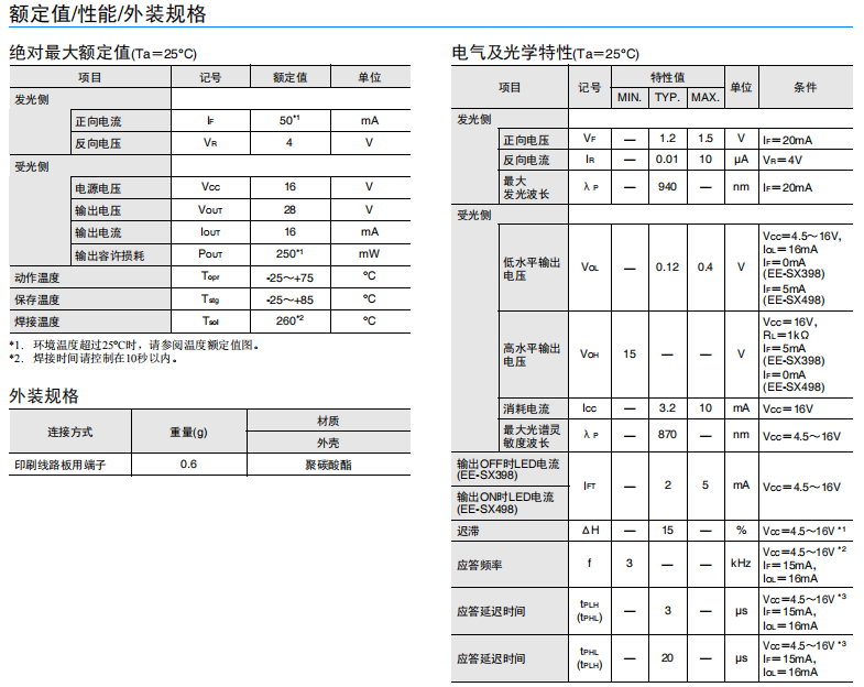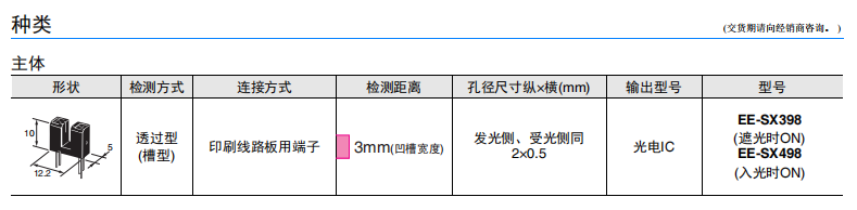 光電IC輸出(分為遮光時ON(EE-SX398)/入光時ON(EE-SX498) 2種類型)