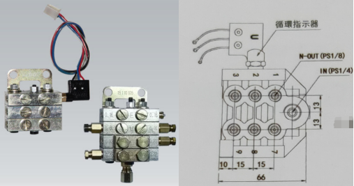 在遞進(jìn)式油路分配器片組中,設(shè)有循環(huán)指示桿,分配器每一次工作循環(huán),循環(huán)指示桿動(dòng)作一次,當(dāng)指示桿伸出接觸到循環(huán)指示器中的微動(dòng)開關(guān),微動(dòng)開關(guān)動(dòng)作,以監(jiān)測(cè)潤滑系統(tǒng)是否出現(xiàn)失壓、斷流或者超負(fù)荷的狀況。