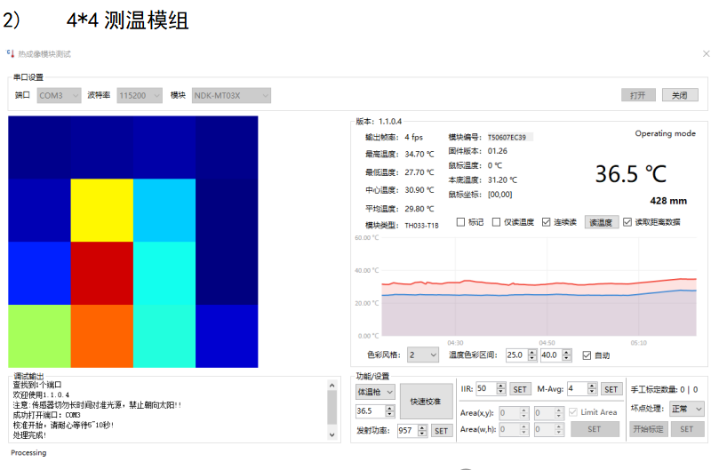 采用串口通信協(xié)議,波特率默認(rèn)115200,8數(shù)據(jù)位,1停止位,無校驗。其中用戶控制端是主機,測溫模組是從機,采用一發(fā)一收。協(xié)議輸出數(shù)據(jù)有兩種查詢命令方式,一是只查詢?nèi)梭w溫度,二是查詢陣列溫度數(shù)據(jù)。